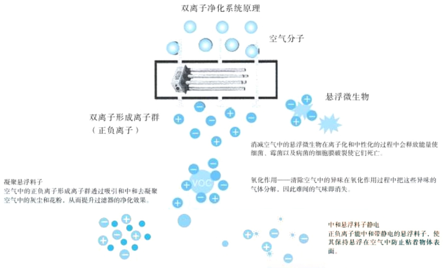 高能離子還可以與室內靜電、異味等相互發生作用,有效地破壞空氣中細菌生存的環境,降低細菌濃度,并將其完全消除。