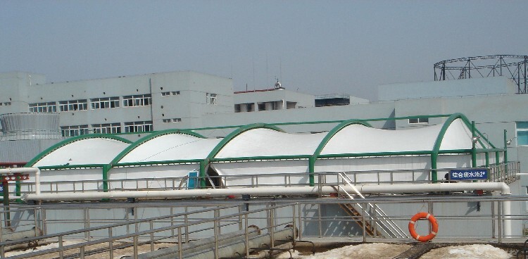 7.結構新穎,傳統的污水池覆蓋方式都是在污水池內部進行尾氣處理,但污水池反吊膜結構采用膜材料半掛的原理,鋼結構為膜材料外層,從根本上避免了鋼結構被池內尾氣腐蝕的現象,延長了鋼結構壽命,提高了反吊膜結構的性能優勢。