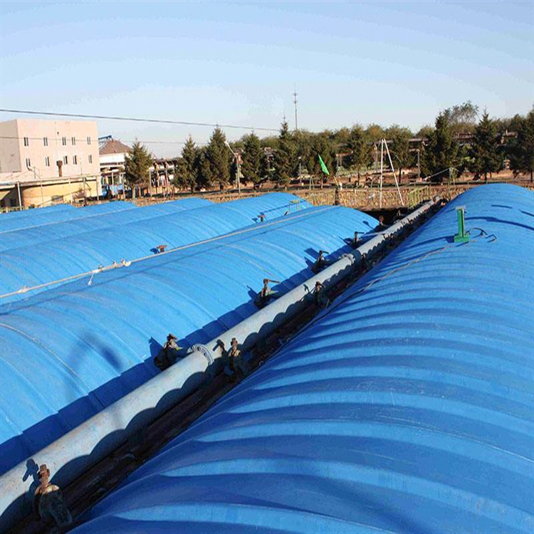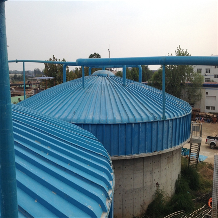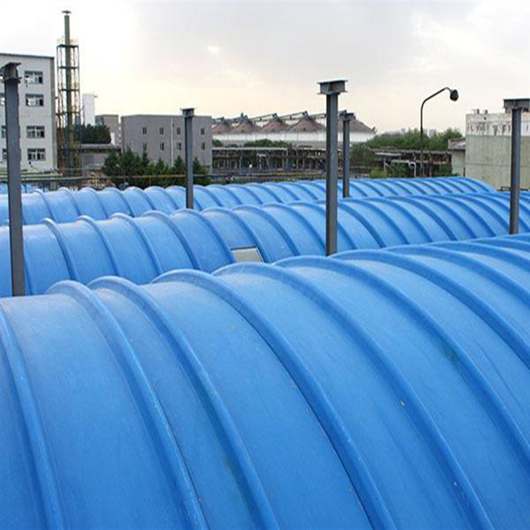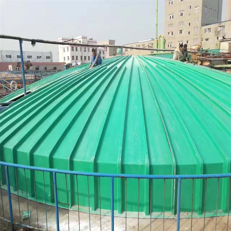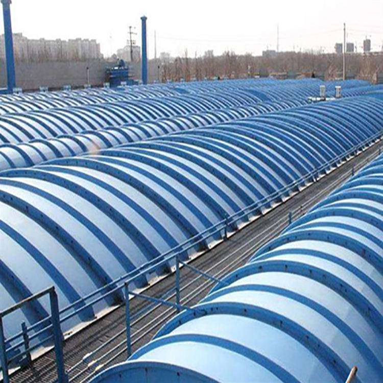 11、為提高產品強度和剛度,根據用戶需要可設計為拱形,供高根據池體跨度確定,集氣罩表面設計為波浪形,產品剛性與載荷大幅度提升,達到高強、安全的目的。對于圓形池體可設計為平板護罩,采用傘形布置、立筋加強,并輔以復合框架支撐。